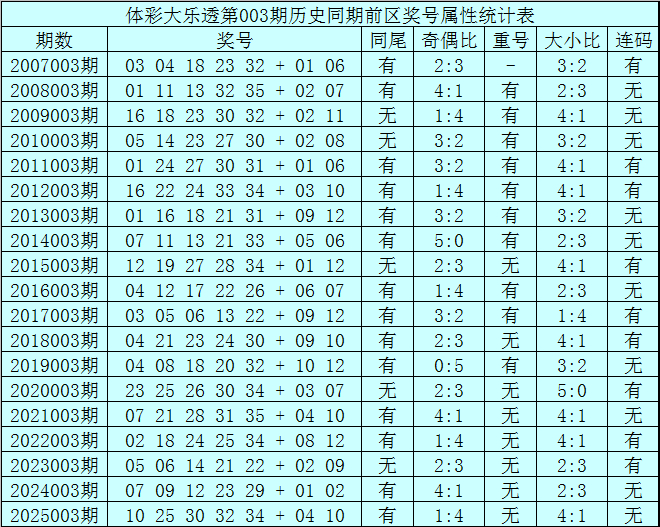 体彩大乐透第003期历史同时开出19次奖号,其统计详见下表: