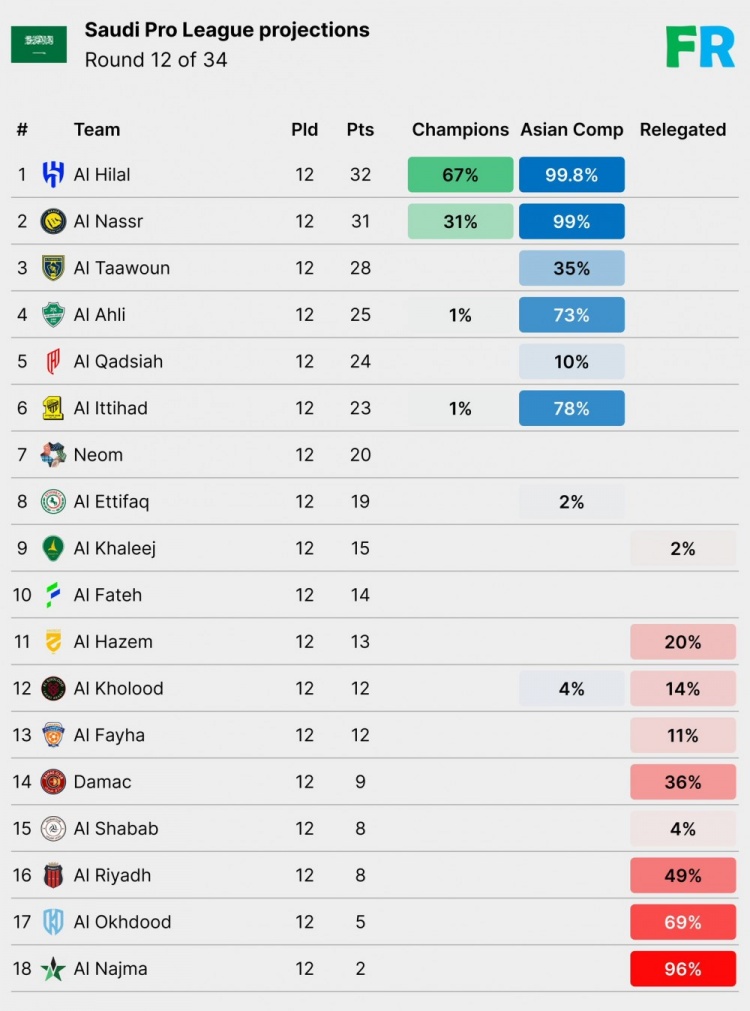 Footy Rankings估计本赛季沙特联赛夺冠概率: