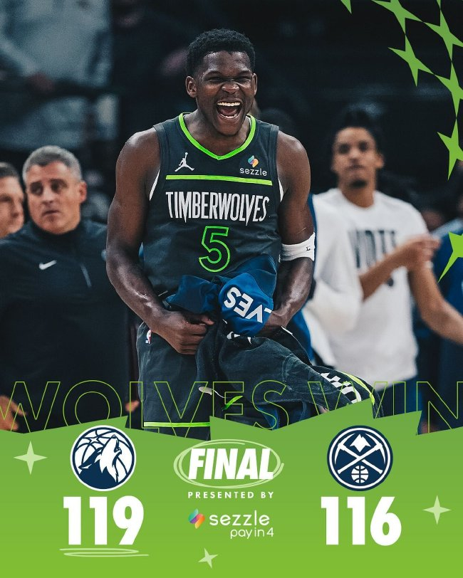 丛林狼(3-2):爱德华兹29分4篮板4助攻、兰德尔23分6篮板7助攻、戈贝尔17分14篮板3助攻、里德16分3篮板、麦克丹尼尔斯10分、康利9分5助攻