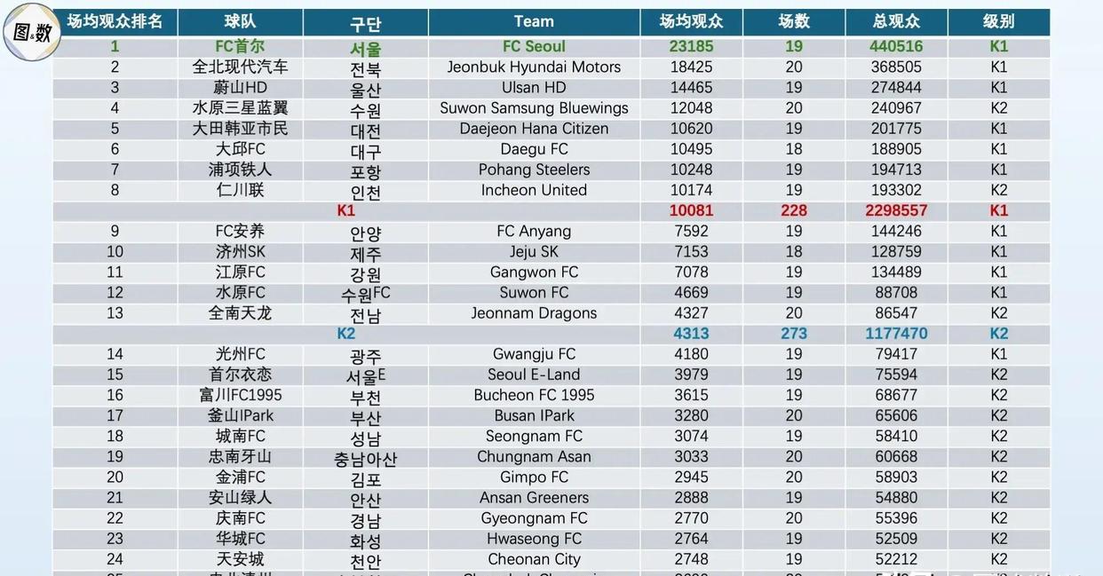 韩国的办事足球,其实分红两档——K1和K2。2025赛季,K1有12支队,统统踢了228场比赛,来现场的东谈主加起来差未几230万,平均一场一万零八十一东谈主傍边。K2这边呢,14支队,打了273场,总东谈主数接近118万,平均每场四千三百多东谈主。