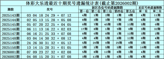 第2026002期奖号:04 08 15 20 31 + 07 08 ,诸君号码遗漏期数为:3期、12期、1期、6期、1期 + 4期、0期。