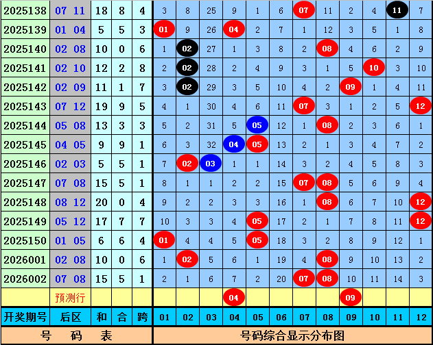 后折柳析:后区上期开出号码07和08,分别遗漏4期和0期,现在后区01-12区间冷温热号码个数比为3:3:6,本期后区注重号码04+09。