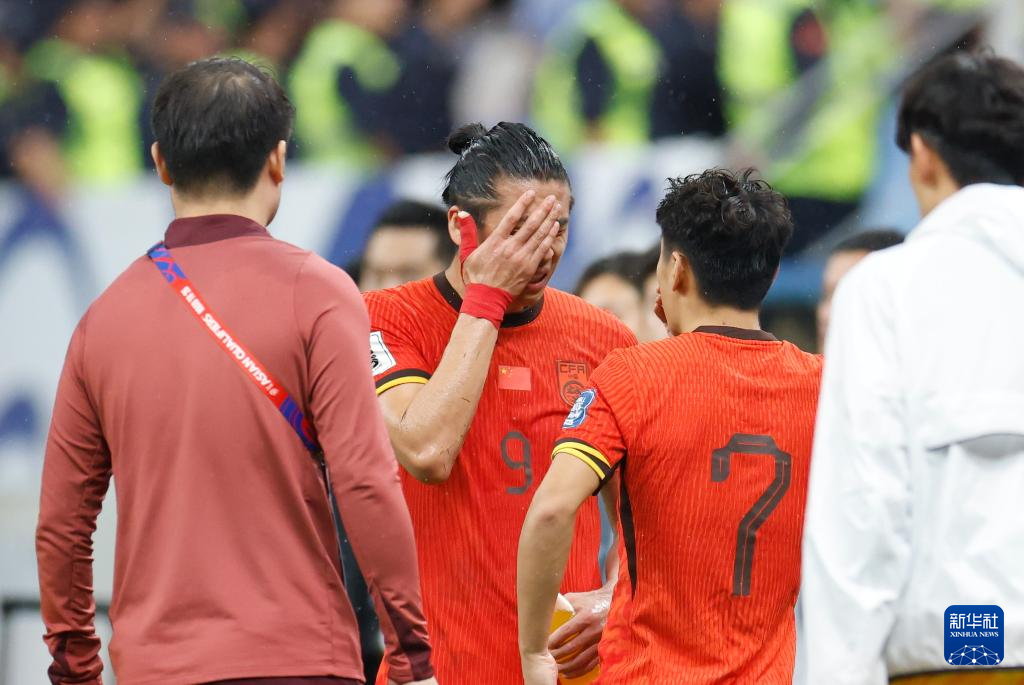 9月10日,中国队球员张玉宁(左二)在比赛后落泪。