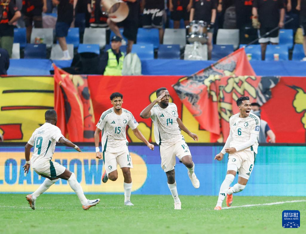 9月10日,沙特队球员卡代什(右三)在比赛终末时间破门得分。