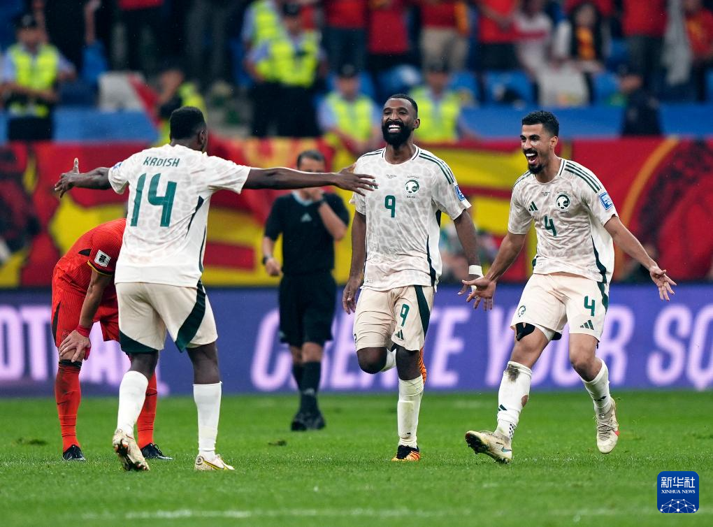 9月10日,沙特队球员卡代什(右二)在比赛中庆祝绝杀进球。