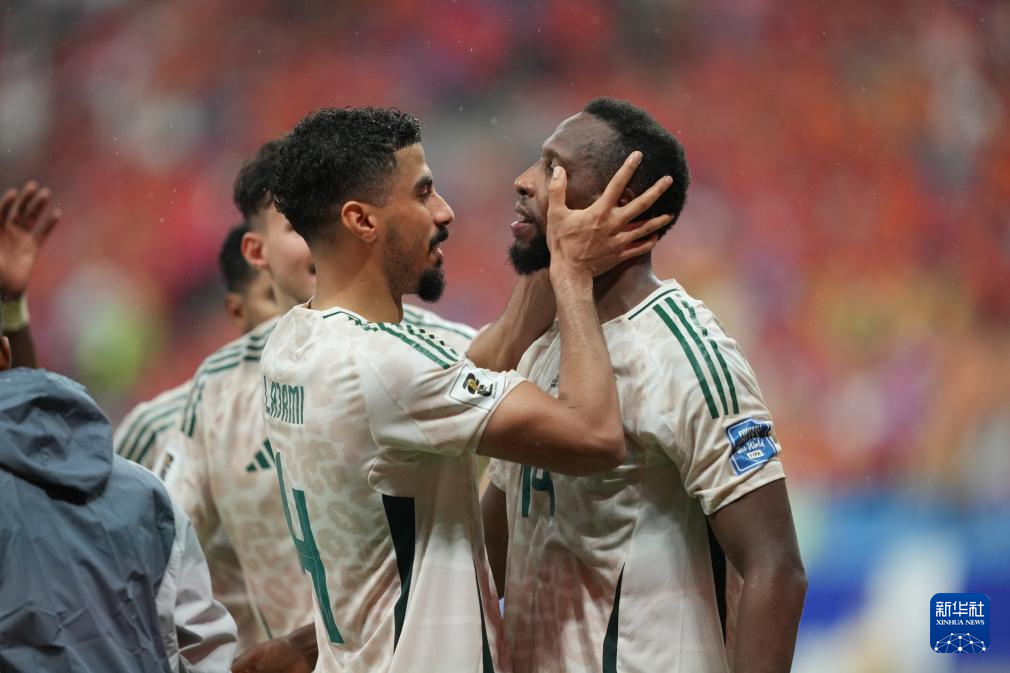 9月10日,沙特队球员卡代什(左)进球后庆祝。