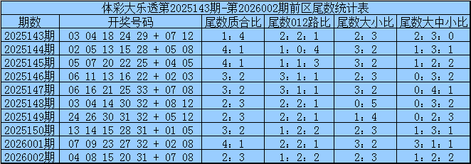 体彩大乐透第2026002期开奖号码为:04 08 15 20 31 + 07 08其中前区奖号奇偶比为2:3,大小比为2:3,012路为1:2:2,前区余数质合比为2:3,012路比为1:2:2,大小比为2:3,大中小比1:2:2。