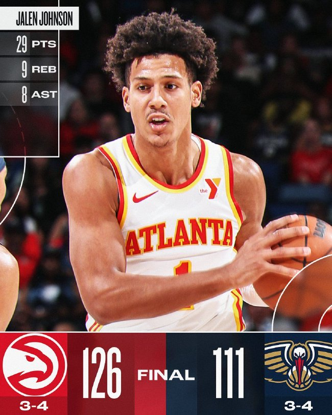 老鹰(3-4):杰伦-约翰逊29分9篮板8助攻2抢断2盖帽、特雷-杨23分4篮板12助攻、里萨谢11分5篮板3抢断、丹尼尔斯16分5篮板3助攻、南斯14分6篮板、马修斯11分3篮板。