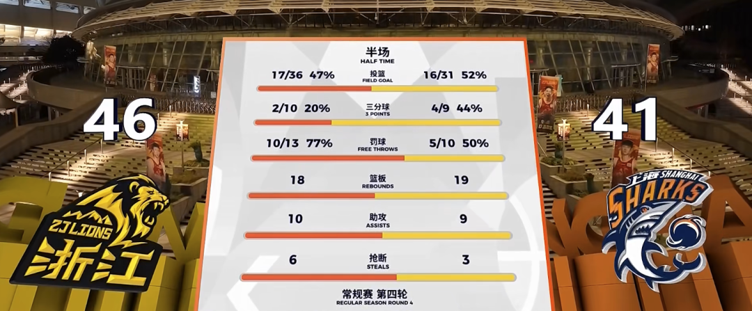 本节末段,广厦依靠着不休的防反打出一波10-2的小高潮,上海久事男篮以41-46过时5分插足更衣室。