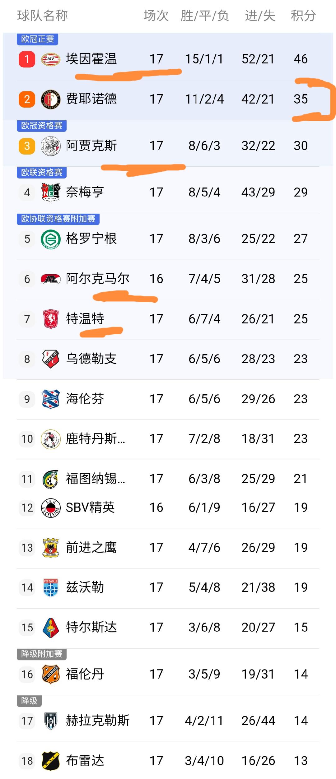 不错看到除了阿尔克马尔和SBV精英队少赛一场除外,其他球队王人也曾踢完毕17轮比赛。